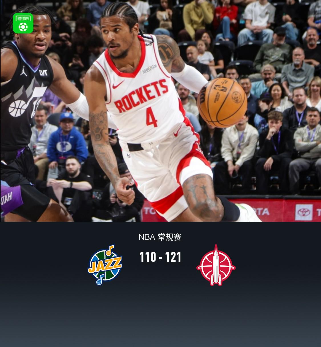 第四节爵士塞克斯顿拿下9分,火箭申京拿下14分,最终爵士110-121不敌火箭